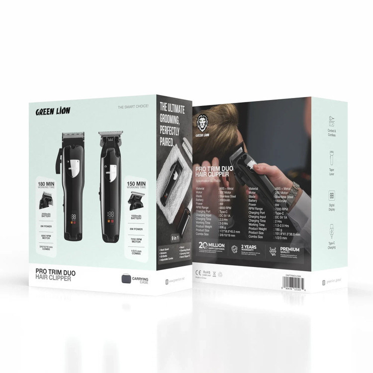 ماشین اصلاح مو گرین لاین پرو ترین دوئو یک ابزار آرایشگری بسیار چندکاره است که برای دقت، قدرت و عملکرد طراحی و ساخته شده است. این ماشین اصلاح مجهز به موتور 337 و تیغههای استیل ضد زنگ است که سرعت 6800 RPM را برای برش سریع و بیدردسر مو فراهم میآورد. باتری 2000 میلیآمپر ساعتی آن امکان استفاده 2 تا 3 ساعته بدون سیم را فراهم میکند و امکان شارژ سریع در 2.5 ساعت از طریق شارژ Type-C وجود دارد. شانههای 3/6/10/19 میلیمتری که همراه با دستگاه هستند، امکان تنظیم طول برش برای انواع سبکها را فراهم میکنند. این ماشین اصلاح که توسط موتور 280 با سرعت 7200 RPM قدرت میگیرد، برای اصلاح دقیق بدن مناسب است. همچنین شانههای 1/2/3 میلیمتری و باتری 1500 میلیآمپر ساعتی آن برای استفاده 1.5 تا 2.5 ساعت طراحی شده و در 2 ساعت از طریق Type-C شارژ میشود. هر دو دستگاه از ترکیب ABS و فلز برای دوام بیشتر ساخته شدهاند و دارای نمایشگر دیجیتال برای نمایش وضعیت باتری هستند. ماشین اصلاح گرین لاین پرو ترین دوئو، ابزار آرایشگری قابل اعتماد و همهکاره شما است که هم به صورت با سیم و هم بیسیم قابل استفاده است و امکان تنظیم سطح تیغه را دارد.