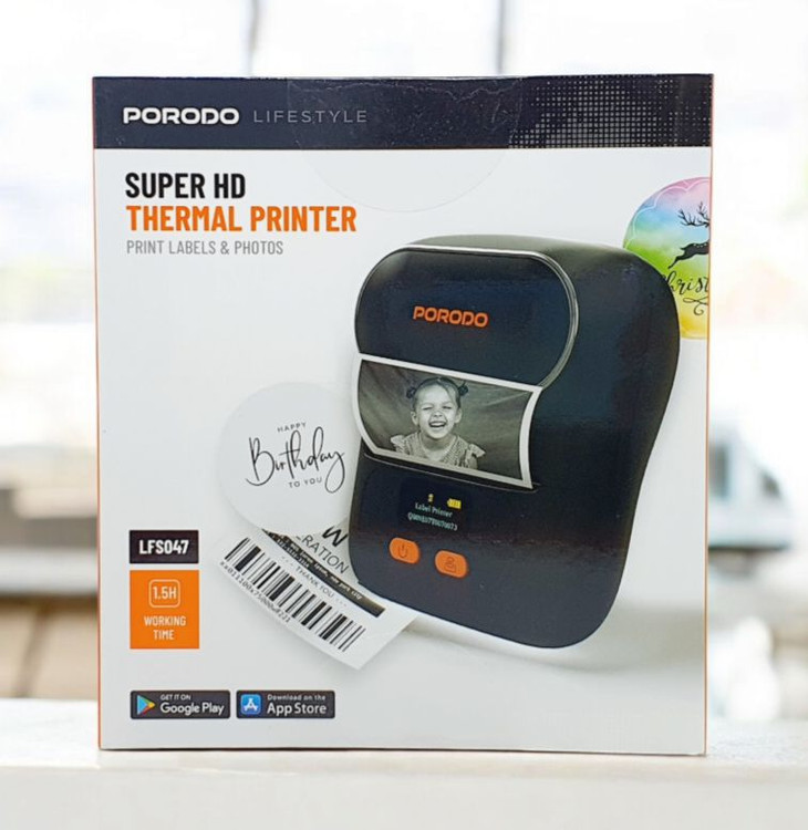 Porodo Lifestyle Super HD یک چاپگر حرارتی کوچک است که در تولید برچسبها و رسیدهای با کیفیت بسیار کارآمد است. این چاپگر با ظرفیت باتری ۱۲۰۰ میلی آمپر ساعتی می تواند تا یک ساعت و نیم بدون نیاز به شارژ مجدد کار کند و با گزینه شارژ Type-C می تواند در عرض دو ساعت و نیم به طور کامل شارژ شود.