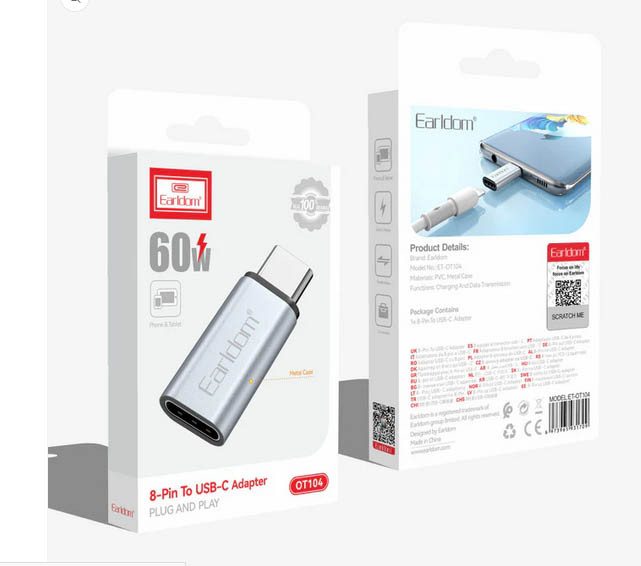 نام و مدل مبدل Lightning به Type-C ارلدام Earldom مدل OT104 توان 60 وات سری 8Pin to USB-C Adapter برند ارلدام - Earldom مشخصات فنی