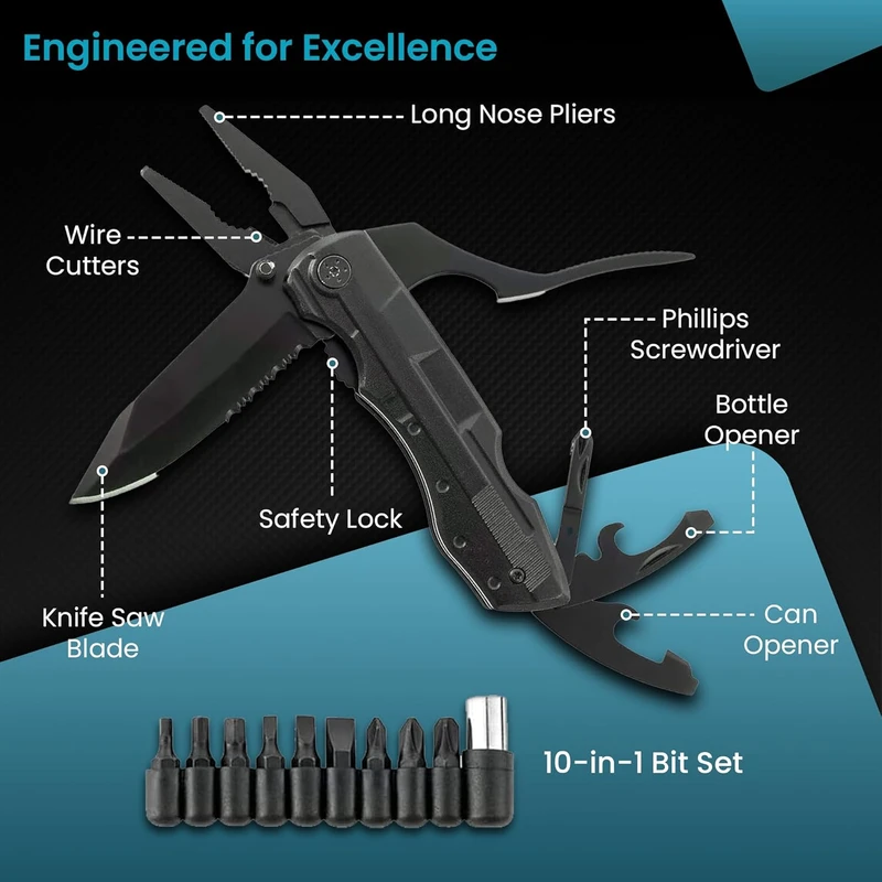ابزار 10 کاره گرین لاین شما را از حمل جعبه ابزار بی نیاز میکند. این انبردست چندکاره از فولاد ضد زنگ بادوام 420 ساخته شده است و دارای تیغه 3.1 اینچی است که می تواند کارهای سخت را بدون زحمت انجام دهد. با این ابزار میتوانید تقریباً هر چیزی را تعمیر کنید. ابزار های این انبردست چندکاره شامل، یک تیغه چاقو، یک اره، انبر دست دمباریک، یک اهرم مفصلی، یک بطری بازکن، یک قوطی بازکن، ۲ سایز پیچ گوشتی تخت و یک پیچگوشتی چهارسو و یک مجموعه 9 عددی پیچگوشتی استاندارد مگنتی است. با استفاده از این مجموعه ابزار جامع، می توانید با دردسر حمل یک جعبه ابزار بزرگ خداحجنس تیغه