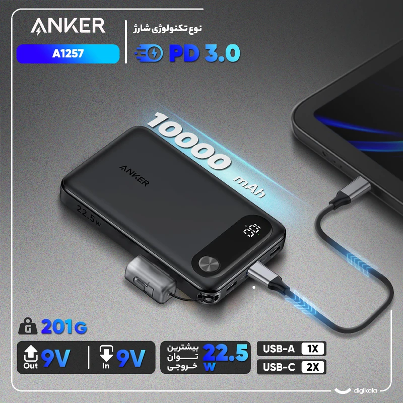 پشتیبانی از شارژ سریع 22.5 وات PD / دارای دو درگاه USB-C و یک درگاه USB-A / کابل داخلی با طراحی لنیارد برای دسترسی آسان و جلوگیری از فراموشی کابل /