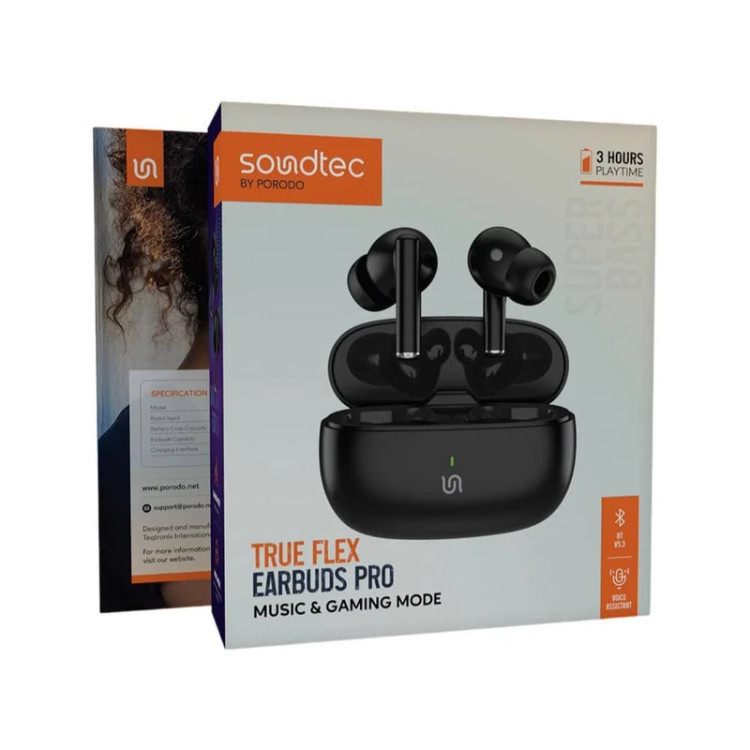 Porodo Soundtec True Flex Earbuds Pro -Wireless Transmission Range: <۱۰M -Frequency Range: ۲.۴GHZ-۲.۴۸GHZ -Battery Case Capacity: ۲۳۰mAh -Gaming Mode & Music Mode -Earbuds Capacity: ۲۵mAh -Charging Interface: Type-C -Bluetooth Version: V۵.۳ -Recharge Time: ۱.۵H -Rated Input : ۵V/۱A -Immersive Audio -Voice Assistant -Touch Control -Play Time: ۳H