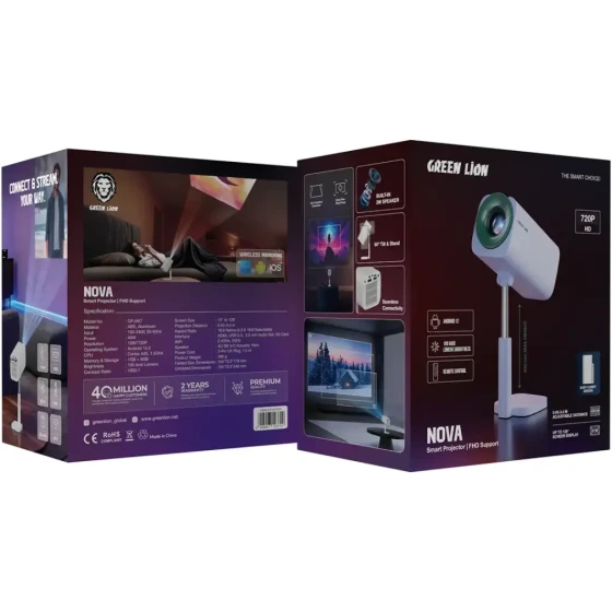 ویدئو پروژکتور Nova Smart از برند Green Lion یکی از مدلهای جدید و هوشمند این شرکت است که با هدف فراهمکردن تجربه سینمای خانگی واقعی در ابعادی کوچک طراحی شده است. این پروژکتور با رزولوشن Full HD و قابلیت نمایش تصویر تا اندازه ۱۲۰ اینچ، برای تماشای فیلم، بازی، کنفرانسهای کاری و کلاسهای آموزشی کاملاً مناسب است.از ویژگیهای برجستهی این مدل میتوان به پشتیبانی از اتصال Wi‑Fi و بلوتوث برای انتقال بیسیم تصویر و صدا، وجود سیستم Android داخلی برای پخش مستقیم فیلم یا استفاده از اپلیکیشنها (مانند Netflix و YouTube) و روشنایی قابل توجه آن اشاره کرد. لنز دستگاه دارای فوکوس دستی دقیق است و چراغ LED با طول عمر زیاد (تا حدود ۳۰٬۰۰۰ ساعت) تصویری شفاف و زنده ایجاد میکند.
